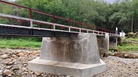 “Kalau pondasi tiang jembatan memang tidak pakai cakar ayam hanya pakai besi yang di tancapkan saja tiga baris kemudian di tumpuk batu hingga ke atas, itu nguruk batunya ngambil dari kali tidak beli, kan gak boleh harus ada izin lagi, ini saja sudah masalah,” kata sumber.