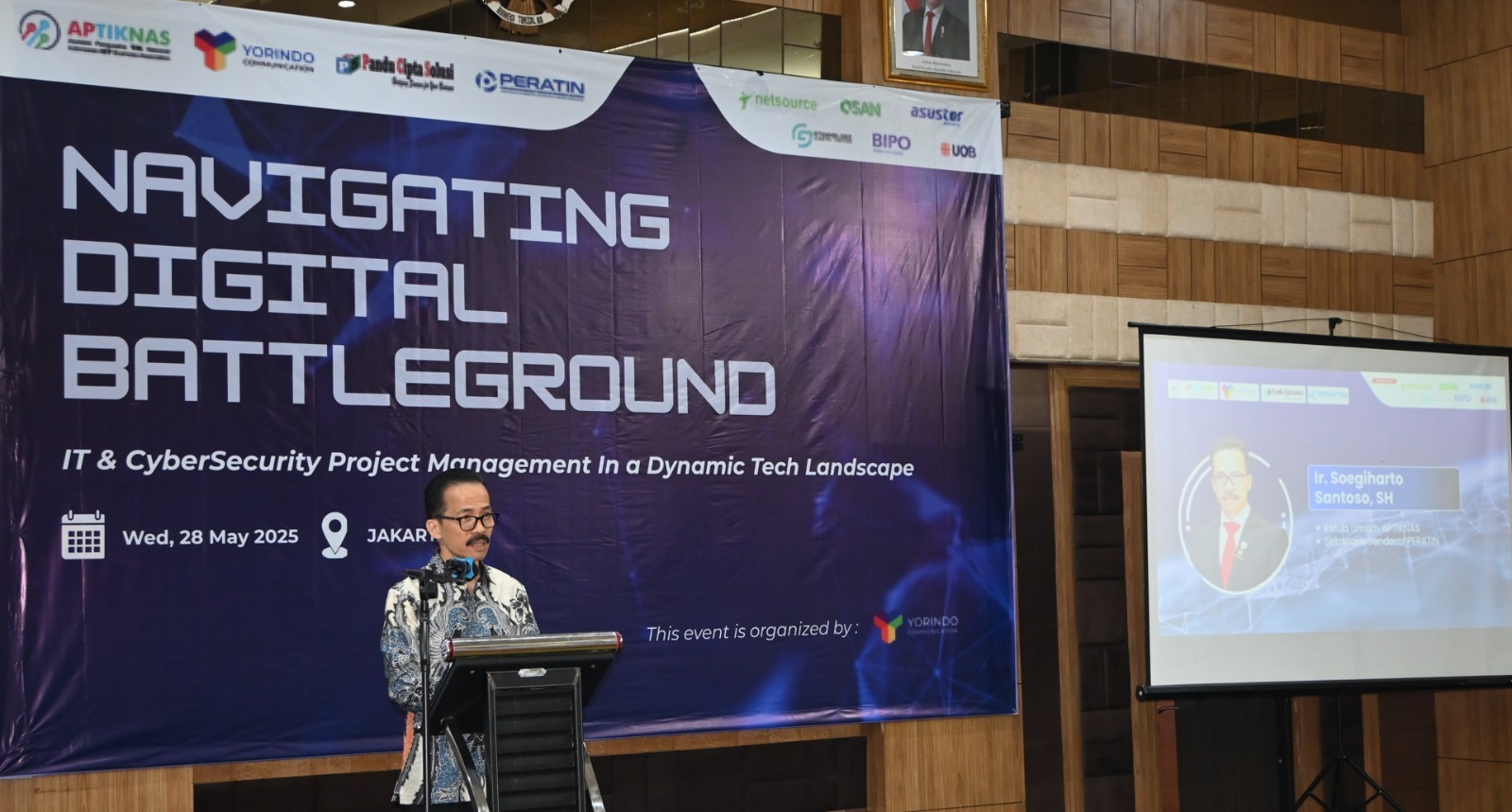 Hal itu disampaikan Ketua Umum APTIKNAS Ir Soegiharto Santoso, SH dalam sambutannya pada acara pembukaan Seminar Navigating Digital Battleground 2025 dalam rangkaian kegiatan Navigating Digital Battleground – IT & Cybersecurity Project Management In a Dynamic Tech Landscape di Grand Cokro Hotel Grogol, Jakarta pada Rabu (28/5/2025).