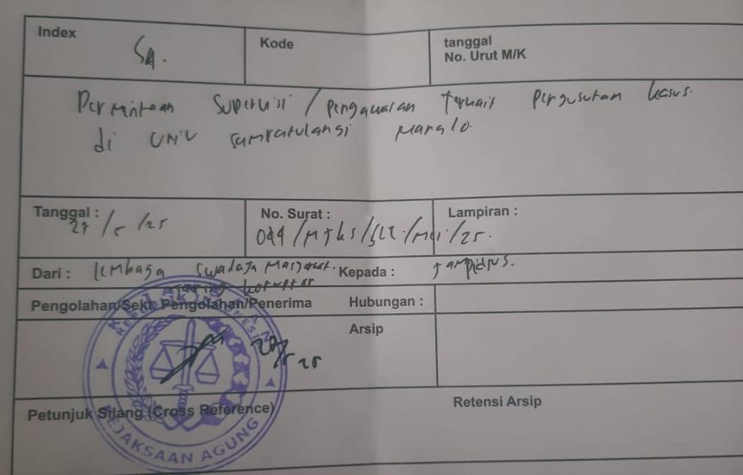 “Kejaksaan Agung harus segera memeriksa dua eks petinggi Unsrat yakni Ellen Kumaat dan Grevo Gerung, karena dalam lampiran dokumen pelaporan, kedua oknum dosen ini turut menerima aliran dana dari kerjasama antara LPPM Unsrat dengan sejumlah Perusahaan di Manado,” ungkap Dadang kepada awak media usai memasukan surat permintaan supervisi dan pengawasan di kantor Jaksa Agung RI, Selasa (27/5/2025) di Jakarta.