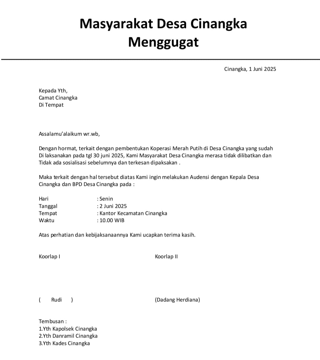 Sejumlah tokoh pemuda dan masyarakat setempat dikabarkan akan menggelar aksi unjuk rasa besar-besaran di depan Kantor Desa Cinangka. Pemicu kemarahan mereka bukan hal sepele: pembentukan Koperasi Merah Putih yang diduga dilakukan tanpa sosialisasi dan tanpa keterlibatan masyarakat luas.