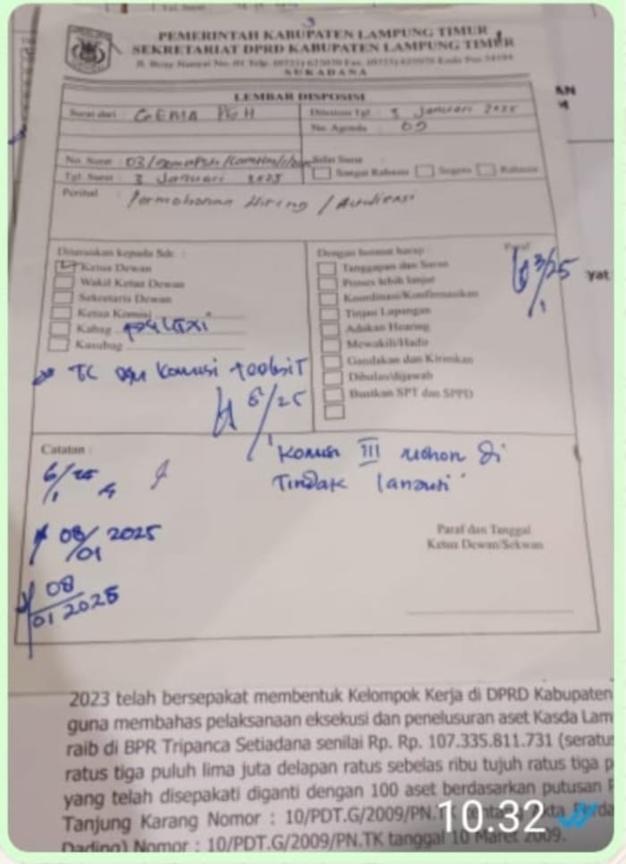 Sopiyan Subing, tokoh muda sekaligus penasihat hukum Ikatan Wartawan Online (IWO) Lampung Timur, mengungkapkan bahwa permohonan RDP telah didisposisi ke komisi 3 sejak tanggal 6 Januari 2025. Namun hingga kini RDP tersebut belum juga terlaksana.