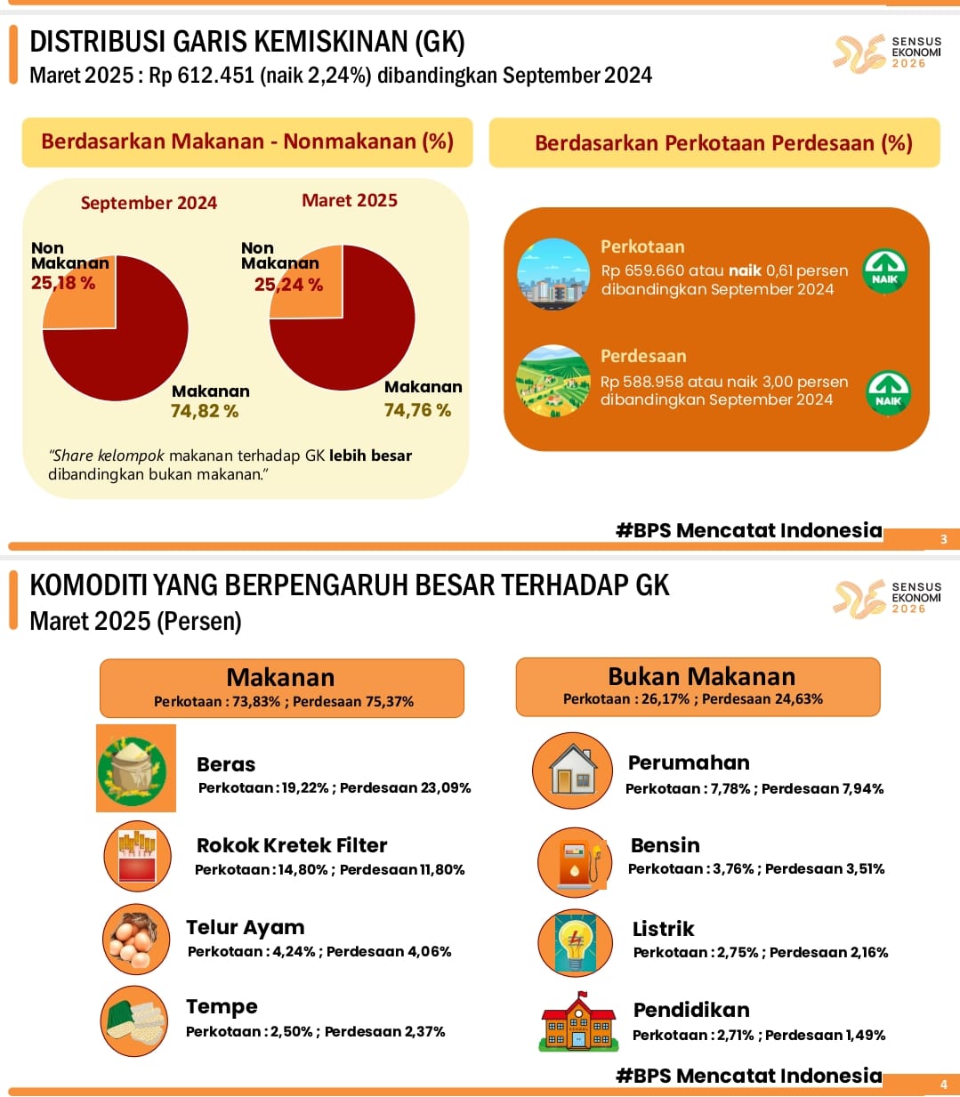 BPS mencatat bahwa garis kemiskinan di perkotaan lebih tinggi dibandingkan pedesaan, dimana garis kemiskinan perkotaan pada Maret 2025 sebesar Rp 659.660 (naik 0,61%) dan perdesaan Rp 588.958 (naik 3%) dibandingkan September 2024. Ini menunjukkan garis kemiskinan di pedesaan lajunya lebih cepat dibanding dengan garis kemiskinan di perkotaan.