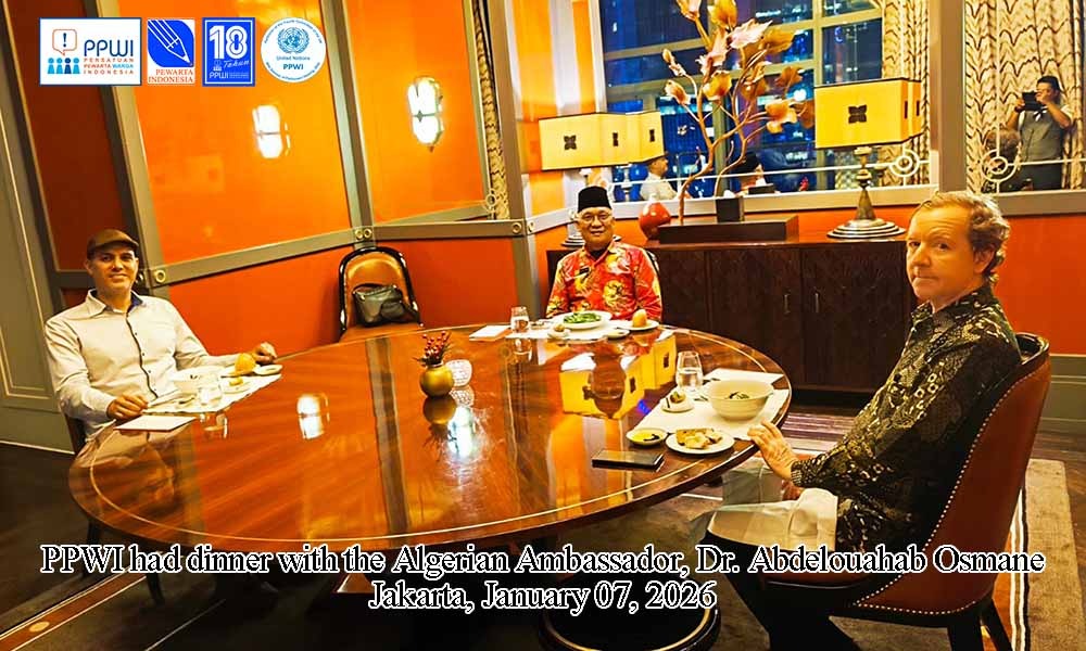 Dalam suasana hangat dan penuh keakraban, Persatuan Pewarta Warga Indonesia (PPWI) menggelar pertemuan khusus dengan Duta Besar Republik Demokratik Rakyat Aljazair untuk Indonesia, Yang Mulia Dr. Abdelouahab Osmane. Pertemuan berlangsung pada Rabu malam, 7 Januari 2026, pukul 19.00 WIB, di Jakarta, dengan format makan malam bersama yang berlangsung selama dua jam.