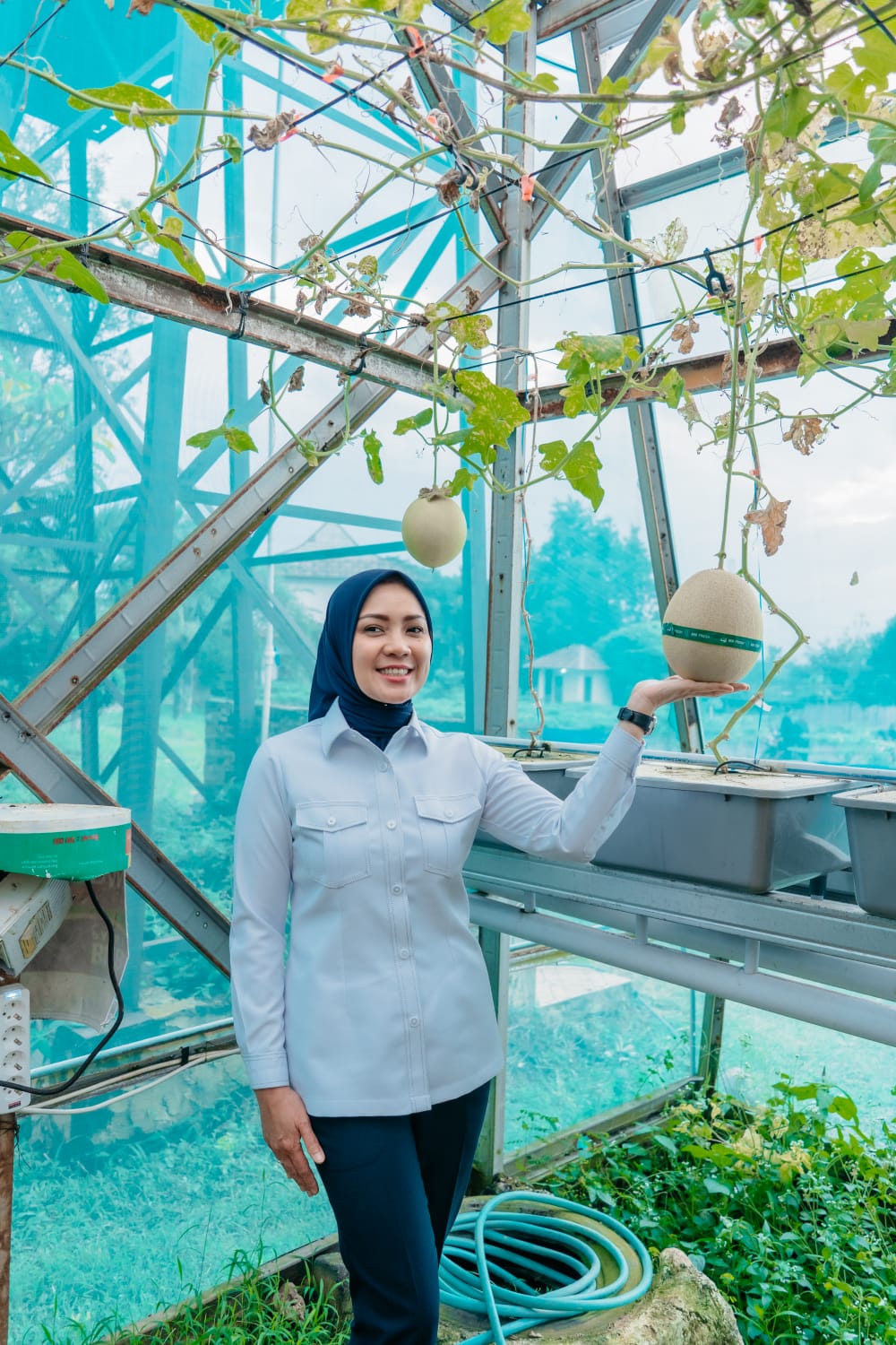 Ketua Tim Penggerak (TP) PKK Provinsi Lampung, Purnama Wulan Sari, melakukan panen buah anggur dan melon sebagai bentuk nyata optimalisasi lahan produktif di PKK Agro Park, Desa Sabah Balau, Senin (26/01/2026).