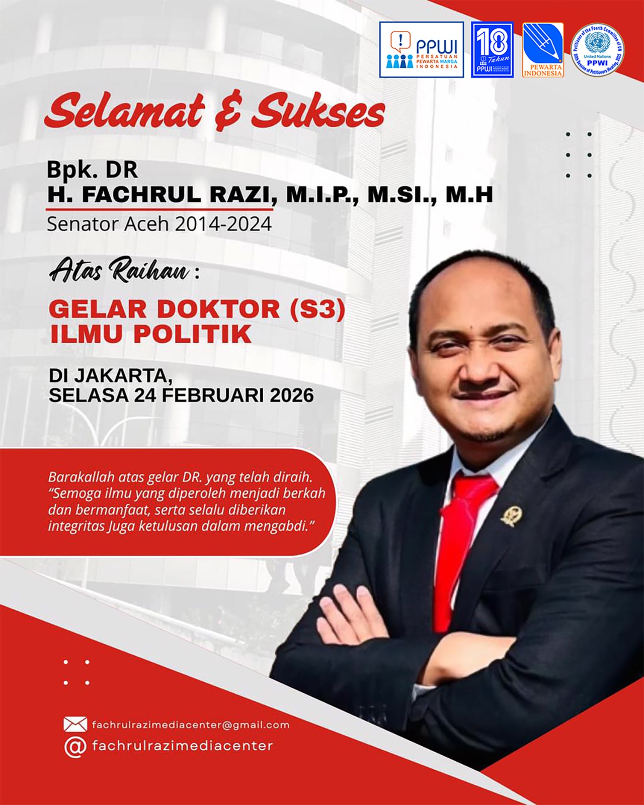 *Atas nama seluruh pengurus dan anggota Persatuan Pewarta Warga Indonesia (PPWI) se-nusantara dan perwakilan PPWI di manca negara, kami mengucapkan Selamat & Sukses kepada Bapak Dr. Fachrul Razi, S.I.P., M.I.P., M.Si., M.H., M.I.Kom (Sekretaris Jenderal DPN PPWI). atas keberhasilannya meraih gelar Doktor di bidang Ilmu Poltik dari Universitas Nasional, Jakarta, pada Selasa, 24 Februari 2026. Tahniah untuk Bang Fachrul Razi.*